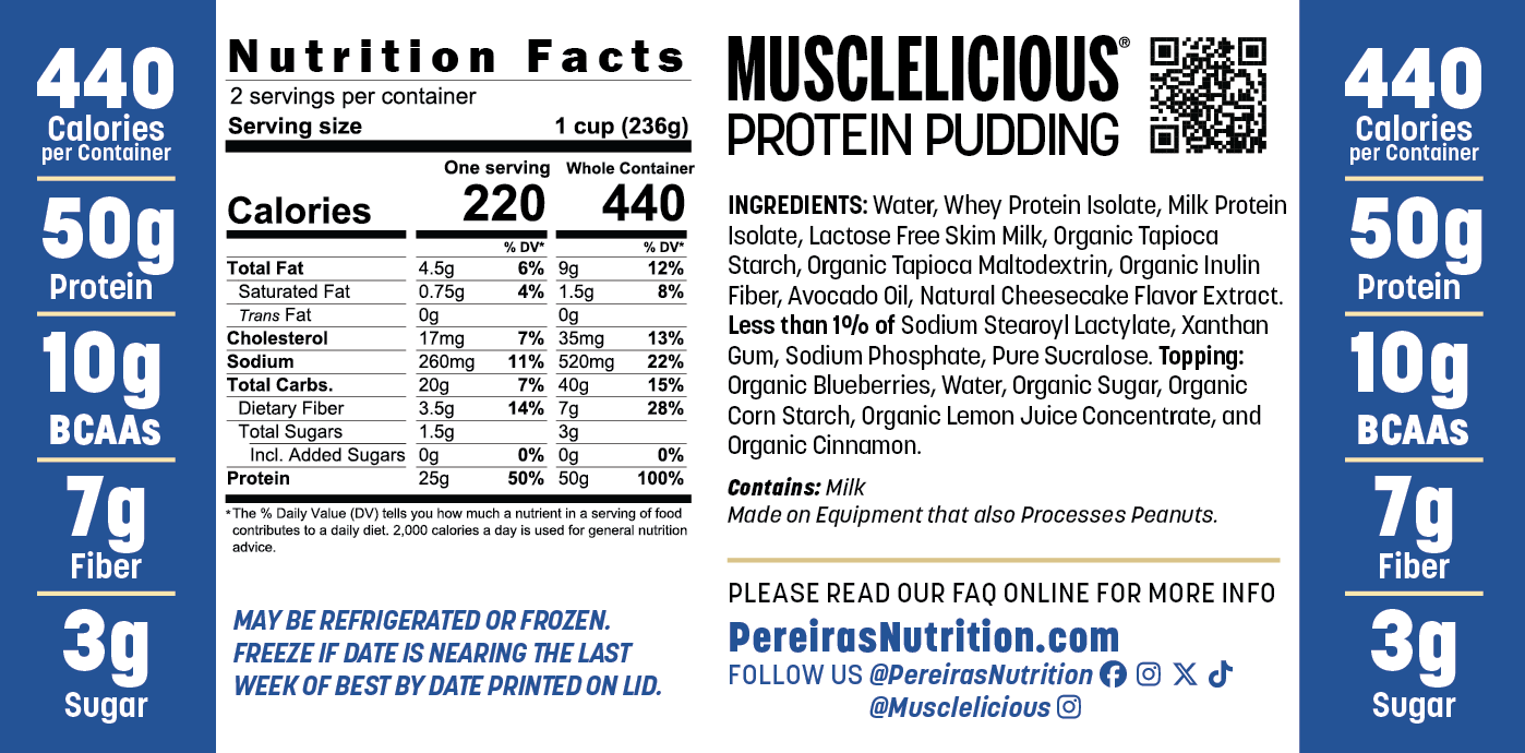 Indulge in a berry-festive feast for the senses with our Musclelicious Birthday Cake Protein Pudding, topped with a generous crown of real fresh organic blueberries that burst with juicy, antioxidant-packed sweetness. Dive into ultra-creamy pudding evoking the whimsical delight of birthday cake batter—rich, buttery, and oh-so-celebratory—elevated by those vibrant, plump blueberries that add a tart-sweet contrast and pop of natural color to every indulgent scoop. Our Blueberry Cheesecake Protein Pudding has a sweet, slightly tart jelly topping made with REAL blueberries on top of our sinfully-delicious cheesecake protein pudding base. This truly is even better-tasting (and more convenient) than the sliced form and better for you too! Such an incredible flavor combination. One taste and you will fully understand why this refreshing cheesecake protein pudding and real anti-oxidant rich blueberries on top are made to be together. Loaded with 25g or 50g of premium whey protein per serving, it's your powerhouse treat for fueling gains, savoring post-workout rewards, or turning snack time into a special occasion, all sweetened purely with our Pure Sucralose for flawless flavor without the sugar hangover.