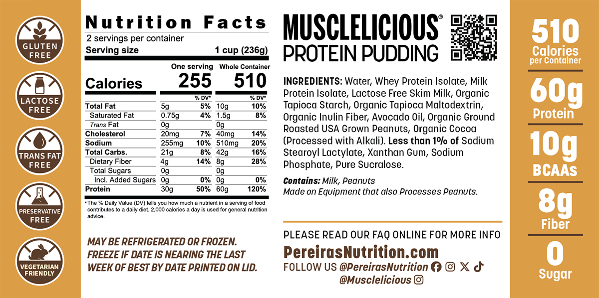 One of the most classic flavor combinations, minus the sugar & packed with high quality nutrition. This PN Protein Pudding is the Chocolate version of Vanilla Peanut Butter Pudding. It is also the Chocolate portion of our Peanut Butter Cup Pudding. If you’re a chocolate + a peanut butter fan, this one is a definite choice for you. One of the most classic flavor combinations, minus the sugar & packed with high-quality nutrition. This Musclelicious pudding is the chocolate version of the vanilla peanut butter Musclelicious pudding. It is also the chocolate portion of our Musclelicious peanut butter cup pudding. If you’re a chocolate and peanut butter fan, this one is a definite choice for you.