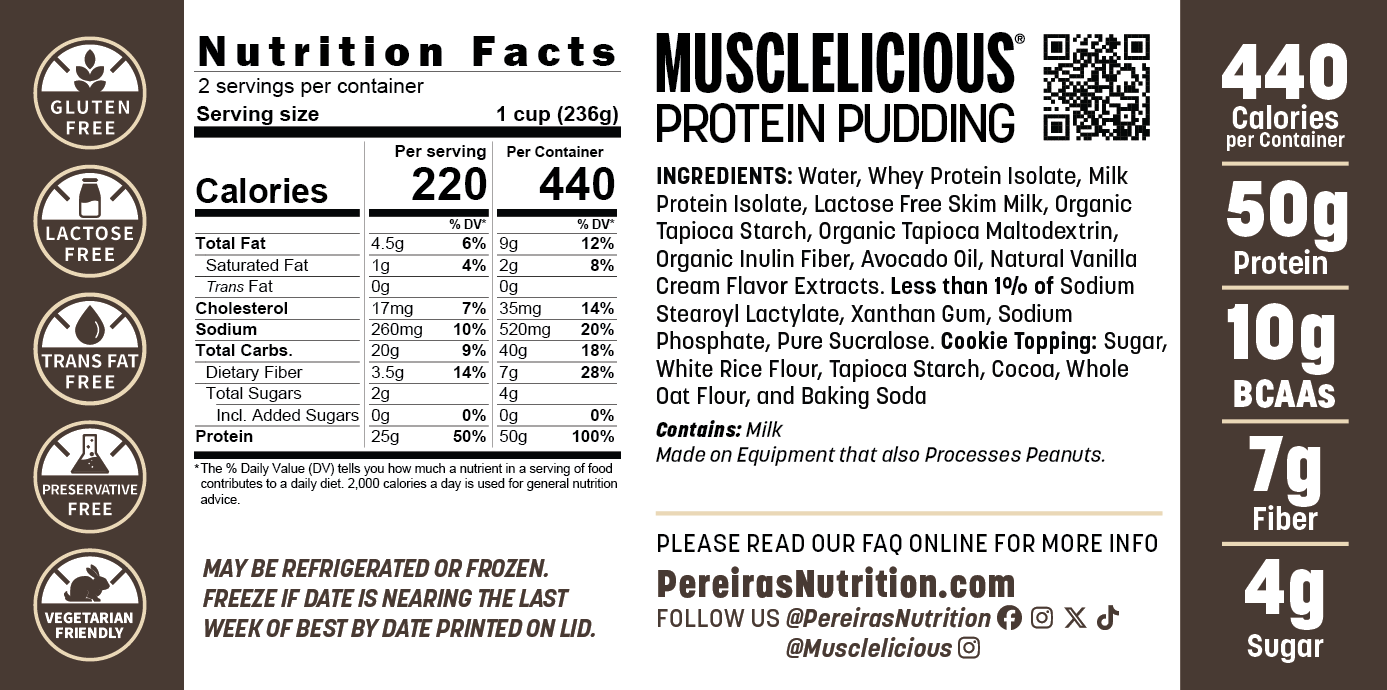 Indulge in the ultimate muscle-building delight with our Musclelicious Cookies n' Cream Protein Pudding—a creamy, dream-worthy treat that packs the nostalgic crunch of chocolate sandwich cookies into every spoonful. Picture rich, velvety pudding swirled with decadent cream and dotted with irresistible cookie fragments for that perfect textural twist, all without a hint of guilt. Loaded with 25g or 50g of premium whey protein per serving, it's your go-to powerhouse for fueling workouts, curbing cravings, or powering through busy days, sweetened solely with our Pure Sucralose for spot-on flavor minus the sugar crash. Musclelicious Cookies n’ Cream Protein Pudding now made with Gluten Free Oreo Cookie topping. Imagine the taste & aroma of the the quintessential, cream-filled sandwich cookie, in a super smooth pudding form. Top it with some cookie crumbles, and voila! You have the best protein-packed cookies and cream treat you’ll ever taste.